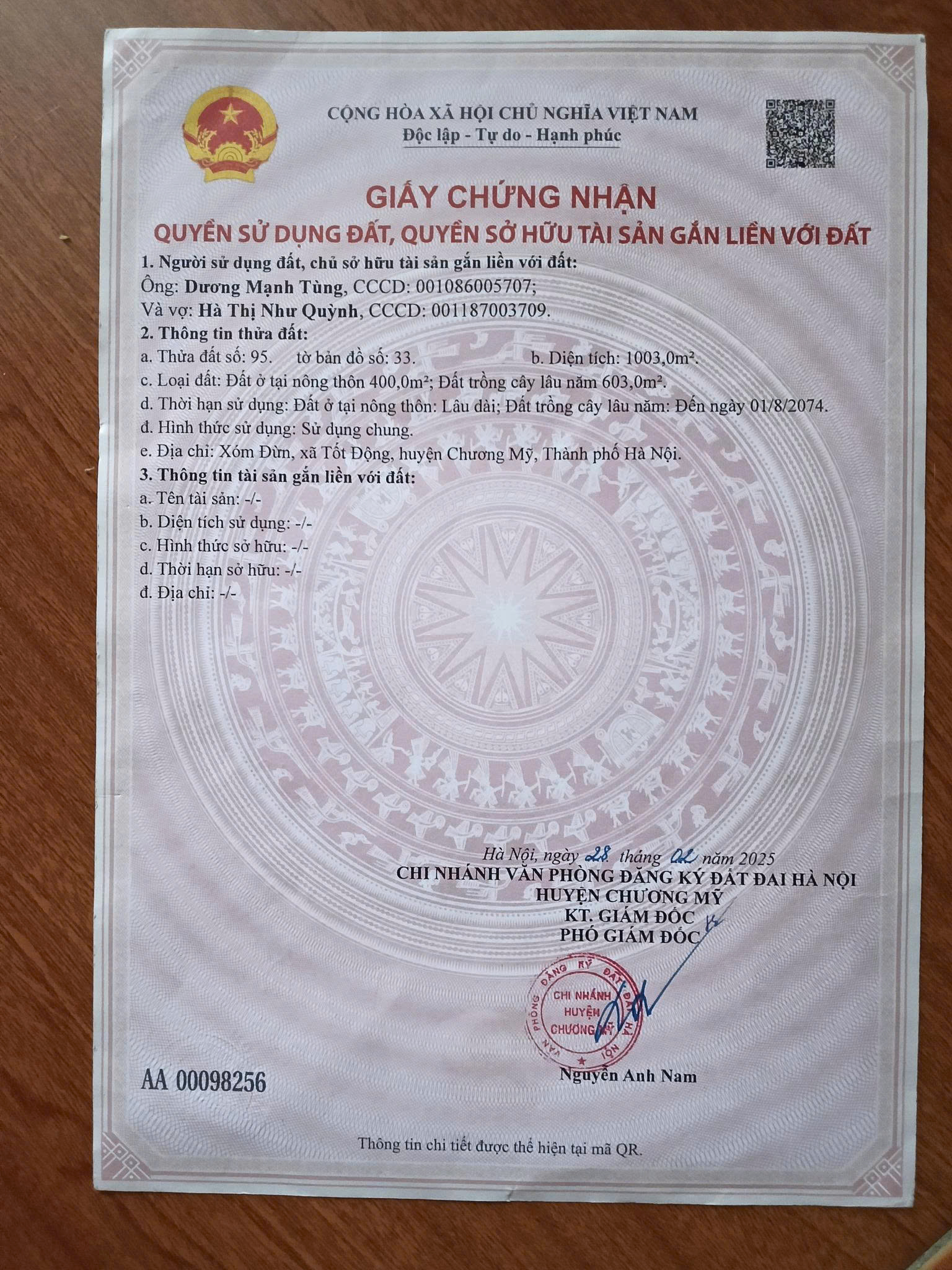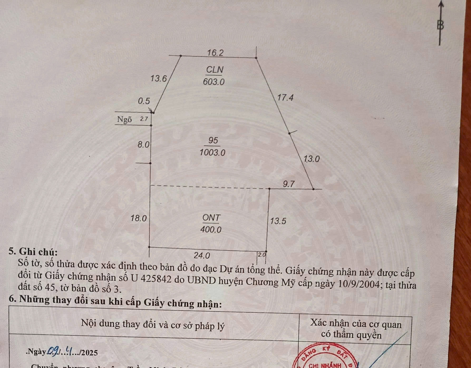 - Diện tích: 1003m, thổ cư 400m