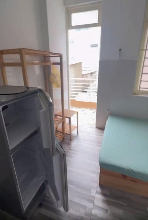Phòng đầy đủ nội thất như hình: tủ lạnh mới, máy lạnh, kệ bếp, kệ treo đồ, tủ đựng đồ.